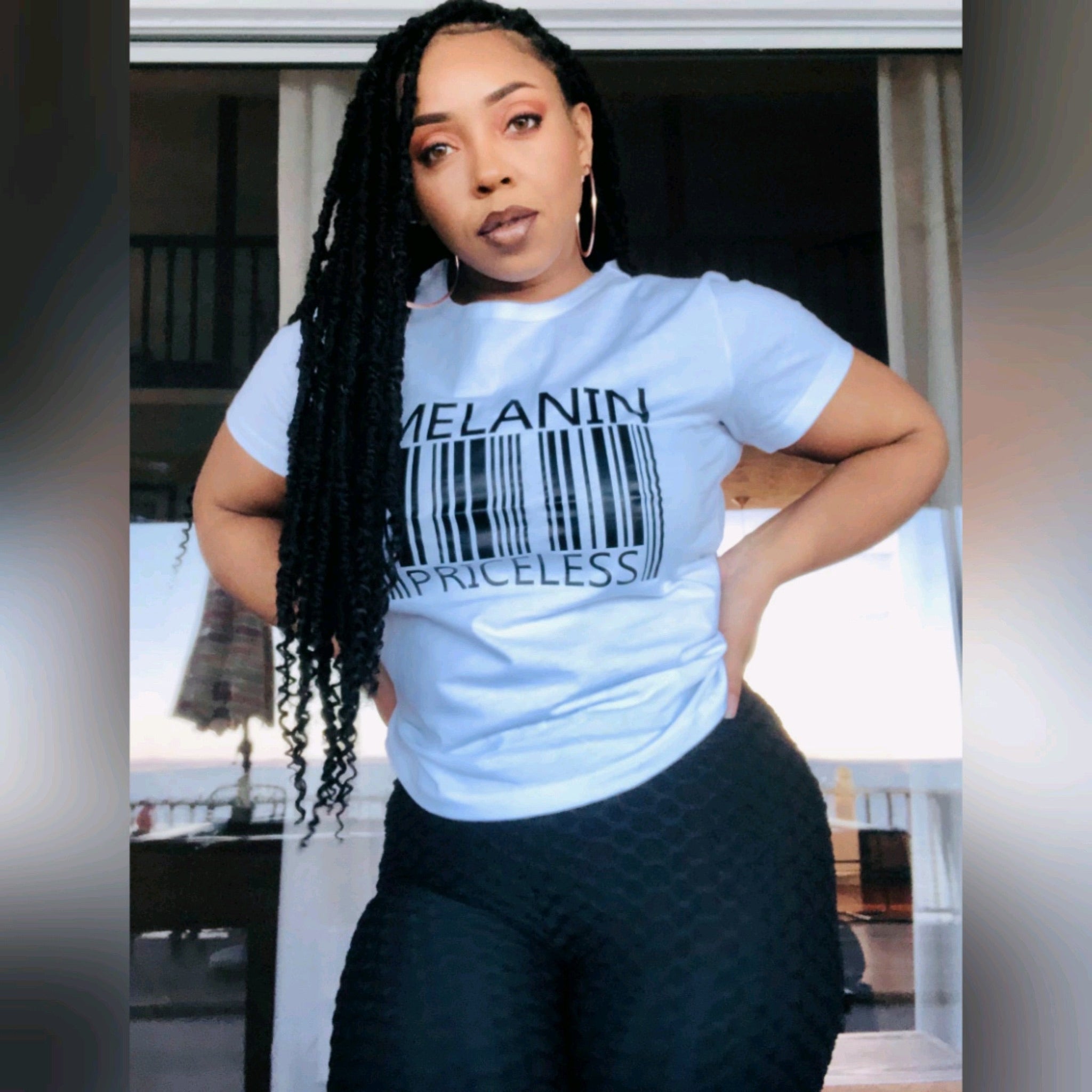 Cotton t-shirt with Melanin Priceless logo. Available in black and white.